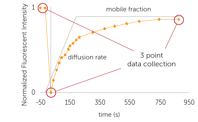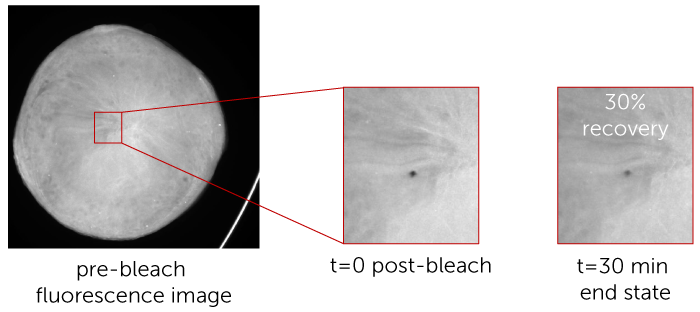 Drops imaged using the complete recovery setting will be photographed many more times following the bleach time (time zero) in order to more closely capture molecular diffusion and generate a single- or double-component Bessel function curve.