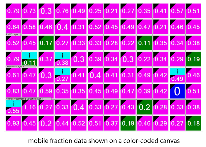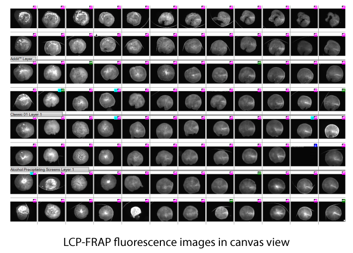 FRAP automatically calculates the percent mobile fraction for each drop. The mobile fraction score can then be related to the ability of the protein in that condition to form protein crystals. The higher the mobility, the greater the chance for crystallization. Scores are displayed in a color-coded overview allowing users to identify positive wells at a glance.