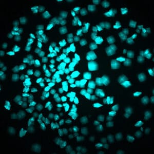 Protein crystallization drops are illuminated with ultraviolet (UV) light, and the fluorescence generated from aromatic amino acids like tryptophan is detected to create an image. If no fluorescence is detected within a crystal, then it lacks enough aromatic amino acids to produce a signal and is likely not a protein.